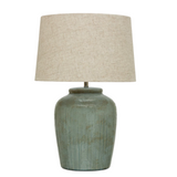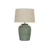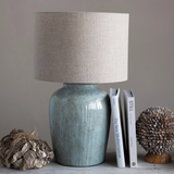 This stoneware table lamp with aqua reactive glaze and natural linen shade is an upbeat accent piece. It'll add touch to nightstands, entry tables, console tables, or side tables and works flawlessly with a wide range of styles.