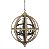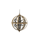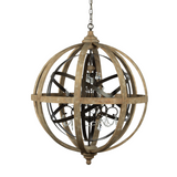 The Kingston Chandelier is a rust color, wooden orb. The layers are made of wood on the outside with an iron inner layer and shining crystal accents. This transitional style chandelier is the perfect accent for any dining room, living room or bedroom.
