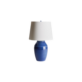 This coastal-inspired lamp has a ceramic body finished off with a deep, rich glaze. The wide drum shade in a soft white linen adds volume and high contrast. A beautiful lighting choice for bedside table, console or study.