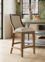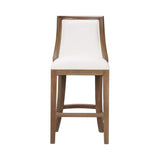 This bar stool blends timeless craftsmanship with modern comfort. It features a solid wood frame in a warm natural finish, paired with a gently curved backrest that offers both support and style. The seat and back are upholstered in a crisp white fabric, creating a fresh contrast against the wood tones. A built-in footrest adds functionality, making it an inviting seating option for kitchens, bars, or casual dining areas.
