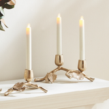 Made from hand-sculpted molds in solid cast aluminum, these nature-inspired branch and leaves taper holders in champagne gold are a substantial accent. Paired with any style taper candles, they make a stunning centerpiece.