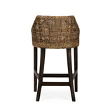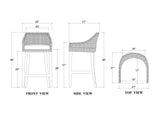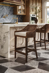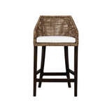 This barstool combines natural elegance with modern comfort. It features a handwoven rattan frame in a rich, warm finish, paired with a plush white upholstered seat cushion for added softness. The low-profile arms and curved backrest create a supportive yet relaxed seating experience, while the dark wooden legs with footrests provide durability and stability. A stylish piece that brings texture and sophistication to kitchens, bars, or casual dining spaces.