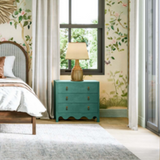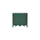 This three-drawer dresser showcases a charming vintage willow green finish, bringing a fresh yet timeless appeal to any space. Elegant gold drop pulls add a touch of sophistication, while the scalloped base enhances its whimsical character. A perfect blend of classic and playful design, this piece offers both style and functionality for bedrooms, living areas, or entryways.