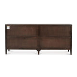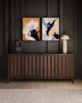This elegant sideboard features a rich, dark wood finish with a beautifully sculpted, textured front that adds depth and visual interest. The four cabinet doors showcase a subtle wave-like pattern, complemented by sleek brass handles that lend a touch of sophistication. Supported by tapered legs, the design combines mid-century modern charm with contemporary refinement. Perfect for a dining room, living area, or entryway, this piece offers both stylish storage and timeless appeal.