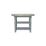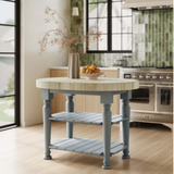 The Farmhouse Butcher Block Kitchen Island in Pale Blue offers a perfect blend of rustic charm and practicality. Featuring a sturdy wood butcher block top, turned legs, and two open slatted shelves, this island provides ample workspace and storage while adding a touch of vintage-inspired elegance to any kitchen.