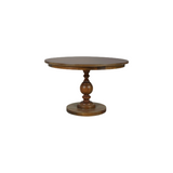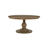 The Goucho Round Dining Table features a classic pedestal base with elegant curves, crafted from solid wood in a warm straw wash finish. Its 48-inch round top provides ample space for dining while maintaining a timeless, rustic charm. Perfect for cozy gatherings and stylish interior