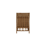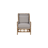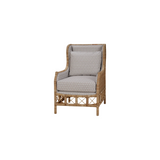 The Hampton Rattan Wing Chair features a natural rattan frame and it includes plush cushions upholstered in a soft, Spivey Rost fabric, offering a light and serene aesthetic. Perfect for relaxing.