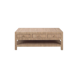 The Kagu Coffee Table showcases natural elegance with its wrapped rattan finish. Featuring three drawers for storage and a spacious lower shelf, it blends functionality with organic texture. Its clean lines and warm tones make it a versatile addition to living spaces.