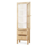 This tall storage cabinet combines timeless design with versatile functionality, available in two elegant finishes: a warm natural woven texture or a soft, subtle gray. Featuring a glass-front upper door with two interior shelves, it offers the perfect display space for décor or everyday essentials. Two spacious lower drawers provide concealed storage, while the clean lines and minimalist silhouette make it a stylish and practical addition to both modern and traditional interiors.
