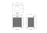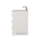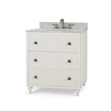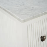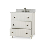 This elegant vanity features a white fluted front design with three spacious drawers, accented by classic round bronze knobs. Topped with a polished marble countertop and vintage-style nickel hardware, it blends timeless charm with modern function—perfect for a refined bathroom update.