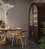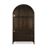 This elegant cabinet features a striking arched silhouette that adds timeless charm and sophistication to any space. Crafted in a rich dark wood finish, it showcases glass-front double doors with sleek metal handles, opening to reveal multiple shelves for displaying books, dinnerware, or décor. The lower section offers additional concealed storage behind paneled doors, making it both functional and stylish. A perfect blend of classic design and modern detailing, this piece enhances living rooms, dining areas, or offices with refined character and practicality.