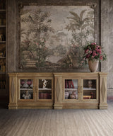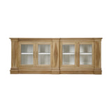 This beautiful piece is a natural wood sideboard featuring a timeless design and elegant craftsmanship. The cabinet showcases four glass-front doors with interior shelving, perfect for displaying décor, dishware, or collectibles. Its light wood finish brings a warm, organic touch to any space, while the diamond-carved detailing on each end adds subtle sophistication. With classic lines and brass-toned handles, this sideboard effortlessly balances rustic charm and refined style and a versatile addition to dining rooms, living spaces, or entryways.