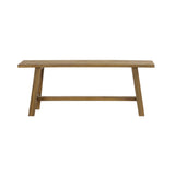 This is a rustic reclaimed teak bench featuring a simple, minimalist design with angled legs and a supportive stretcher bar. Its warm wood tone and natural grain bring a touch of organic charm, making it ideal for entryways, dining areas, or outdoor spaces.