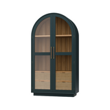 The Vannes Display Cabinet showcases a stunning arched design, combining elegance and functionality. Its glass-paneled doors reveal spacious shelves ideal for displaying books, collectibles, or décor. The lower section features woven rattan drawers for concealed storage, while the deep navy frame and natural wood interior create a stylish contrast. Perfect for modern or traditional interiors.