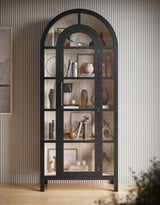 The Vannes Display Cabinet exudes timeless elegance with its vintage black finish and subtle putty interior. Featuring arched glass-paneled doors, this striking piece offers a sophisticated way to showcase décor, dinnerware, or collectibles. The spacious shelving and sleek metal handles blend functionality with refined style, making it a statement addition to any dining or living space.