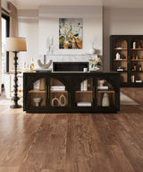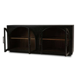 This four-door sideboard features a striking vintage black finish with a subtle straw-wash interior, creating a sophisticated contrast. The arched glass-paneled doors add an elegant touch while offering a glimpse of the spacious shelving inside. Accented with sleek metal handles, this piece blends timeless design with modern functionality, making it a stylish storage solution for any living or dining space.