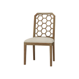 The Ceylon Dining Chair exudes sophistication with its geometric honeycomb backrest design, crafted from rich wood for a natural, elegant finish. Complemented by a plush, upholstered seat in a neutral tone, this chair offers both style and comfort, making it a perfect addition to any dining space.