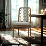 The Ceylon Dining Chair exudes sophistication with its geometric honeycomb backrest design, crafted from rich wood for a natural, elegant finish. Complemented by a plush, upholstered seat in a neutral tone, this chair offers both style and comfort, making it a perfect addition to any dining space.