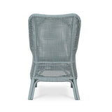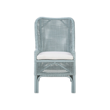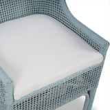 The high, structured back and full apron sides create a commanding silhouette, while the plush removable white cushion provides comfortable seating. This chair is a perfect accent for sunrooms, living areas, or covered porches, bringing texture and beach-inspired color to any space.