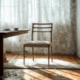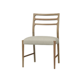 The Laurent Dining Chair features a sleek, modern design with a natural wood frame and an open-back ladder design for an airy aesthetic. Its padded seat is upholstered in a neutral fabric, ensuring both comfort and versatility. Ideal for contemporary dining spaces, it combines minimalist elegance with practical functionality.
