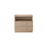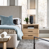 Bring a natural touch to bedsides with the Nightstand, a fresh oak-finished piece built with two drawers, an open-air shelving display and modern bar hardware.