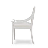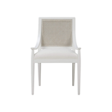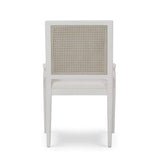 This collection highlights three distinct design aesthetics: a white Chinoiserie side chair featuring a faux-bamboo frame and geometric fretwork, a Mid-Century Modern wooden armchair with an organic, honey-finished silhouette and contoured seat, and a coastal side chair defined by a black frame and striped, hand-woven rope. Completing the set is a French-style armchair that blends a white lacquered frame with a natural cane back and plush upholstery for a light, transitional look.