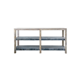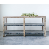 This is a reclaimed wood and metal credenza featuring a rustic design with an open-shelving layout. The sturdy frame is crafted from weathered wood, complemented by industrial-style dark metal shelves, offering both durability and charm. Its minimalist design makes it versatile for various spaces, ideal for showcasing decor or organizing essentials.
