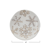 This stoneware plate with gold electroplated snowflakes in white and gold is a festive and elegant piece that will enhance the home decor. The plate features a white and gold color that adds some contrast and sophistication to any space. The plate also features gold electroplated snowflakes that add some sparkle and charm, creating a stunning and unique display. The plate is made of sturdy and durable stoneware, with a smooth surface that makes it easy to clean and maintain. The plate is versatile and functional, as it can be used as a serving plate, wall decor, or a display item. The plate measures 6 inches in diameter. From everyday meals to special occasions, this versatile dinnerware plate adds a touch of sophistication to every setting. A festive and elegant stoneware plate with gold electroplated snowflakes, in white and gold color. A perfect and unique piece that can celebrate the spirit and joy of the winter season. A versatile and functional piece that can be used as a serving plate, a wall decor, or a display item.