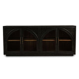 This four-door sideboard features a striking vintage black finish with a subtle straw-wash interior, creating a sophisticated contrast. The arched glass-paneled doors add an elegant touch while offering a glimpse of the spacious shelving inside. Accented with sleek metal handles, this piece blends timeless design with modern functionality, making it a stylish storage solution for any living or dining space.
