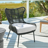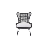 The shapely Hatteras Lounge Chair features a wingback-inspired frame wrapped in dark gray woven rope, creating a welcoming accent piece to suit a variety of design styles.