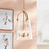 Made of a custom glass mold, this pendant is well proportioned. In a clever design decision, the top metal detail goes through the glass, creating a unique look.
