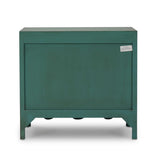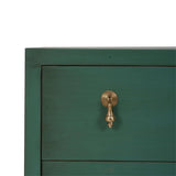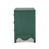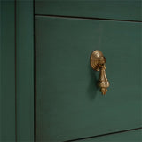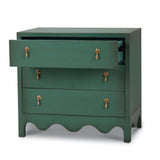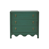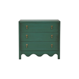 This three-drawer dresser showcases a charming vintage willow green finish, bringing a fresh yet timeless appeal to any space. Elegant gold drop pulls add a touch of sophistication, while the scalloped base enhances its whimsical character. A perfect blend of classic and playful design, this piece offers both style and functionality for bedrooms, living areas, or entryways.